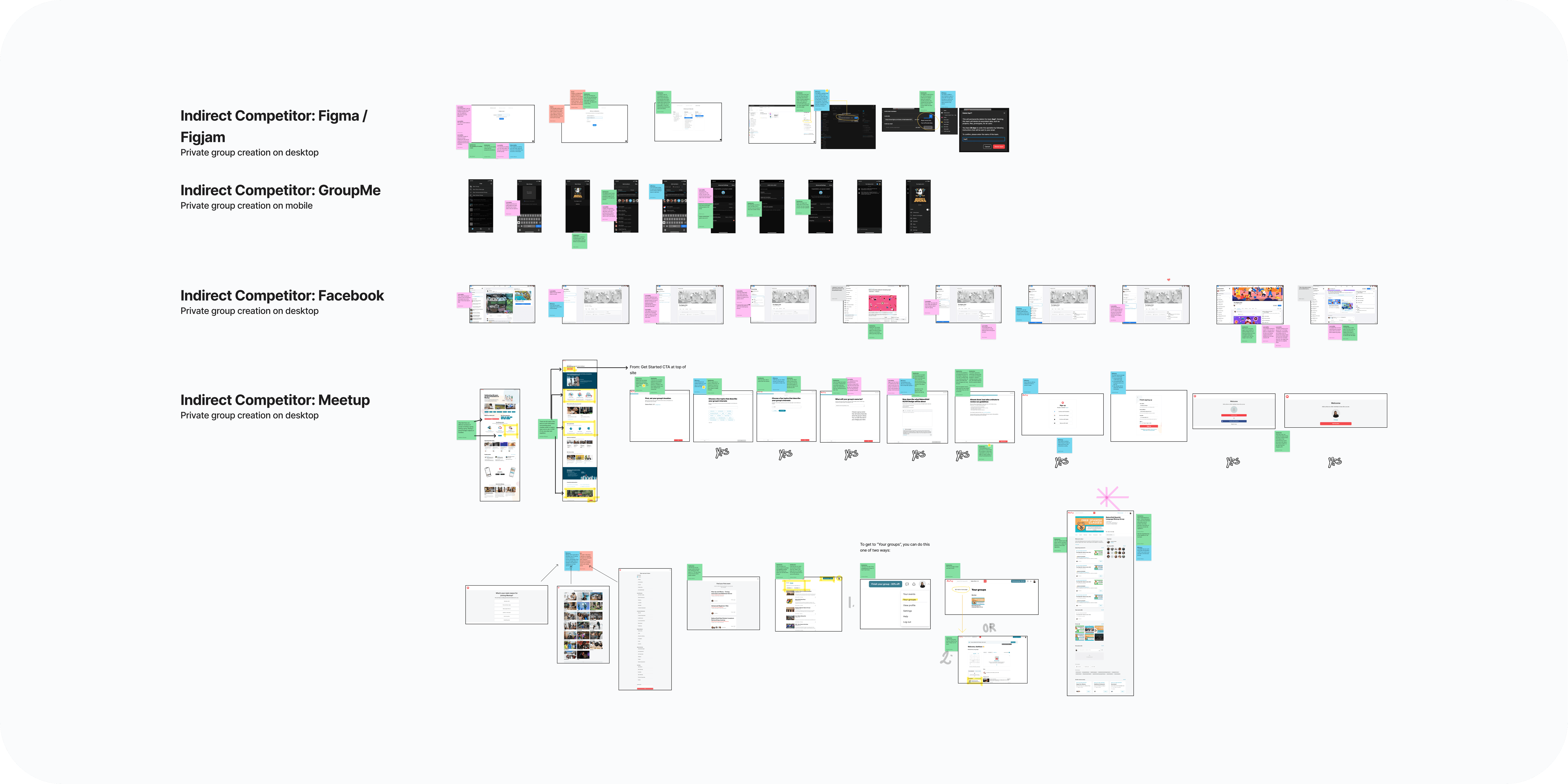 Next, we conducted competitor benchmarking to help us understand the existing patterns and solutions in other products. We chose to focus on Figma, GroupMe, Facebook, and Meetup not as direct competitors, but as products with successful approaches to group creation.